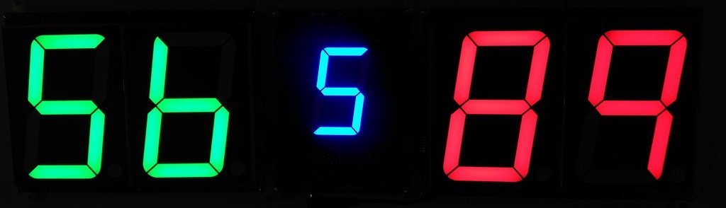 The left hand side digits are displayed in RED and the right hand side digits are displayed in GREEN or BLUE.