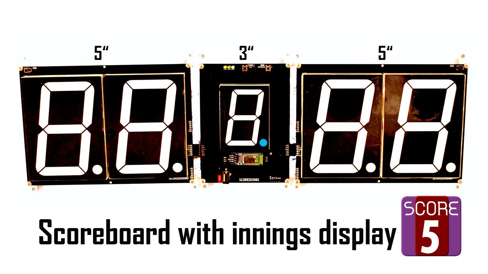 This scoreboard is also a two teams/player scoreboard that has 5 digits and works with the SCORE5 module of the scoreduino app. The 4 digits are for displaying the scores of two teams and the middle single digit is for displaying the innings.