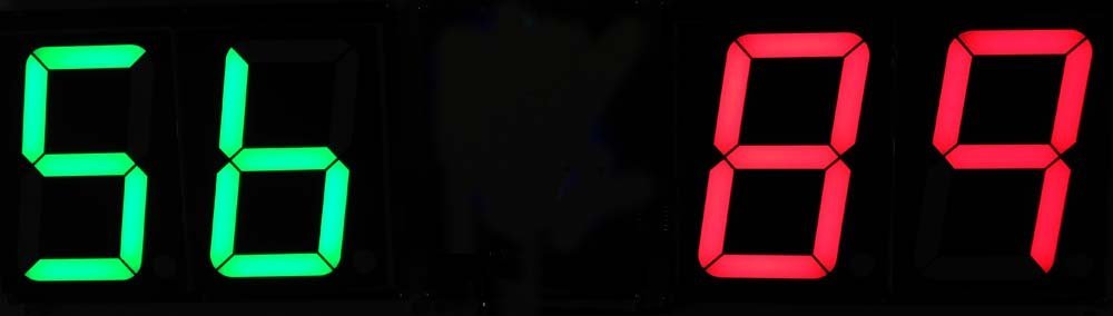 The left-hand side digits are displayed in RED and the right-hand side digits are displayed in GREEN or BLUE.