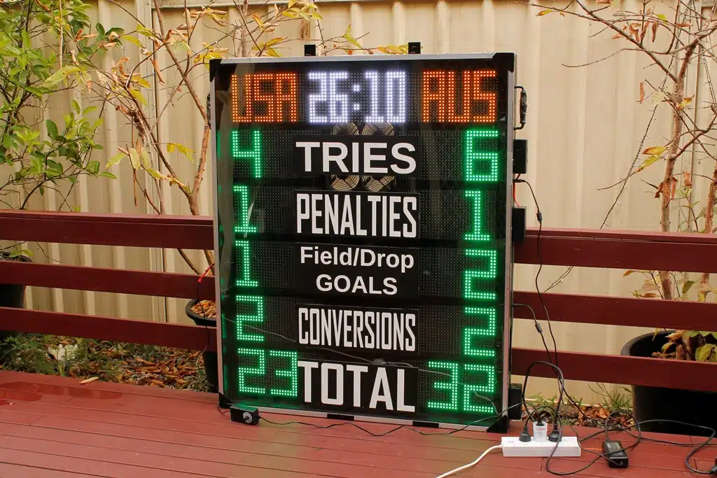 Make your next rugby match unforgettable with our state-of-the-art Scoreduino digital scoreboard! Perfect for community-level games, this professional-grade scoreboard displays tries, penalties, conversions, field/drop goals, team titles, and a timer – all controlled via a dedicated Android app.