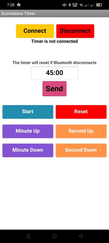 Step 4: Go to Scoreduino’s timer app and press Connect. Select the Bluetooth module from the list of Bluetooth devices. If the timer is connected, you hear ‘Timer is connected’ sound and the app interface will also display a text ‘Timer is connected’. You will also notice a red flashing LED on the board which indicates the connection between your phone and timer.