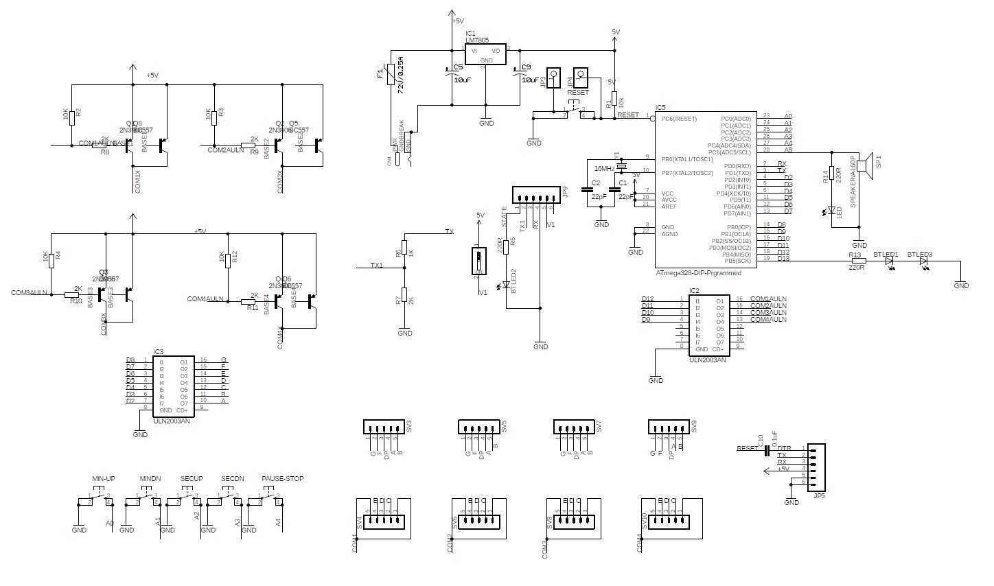 Scoreduino timer is the most important part of Scoreduino project. It is a countdown timer with four 2.3″ common anode displays. It comes with a buzzer and an LED to indicate the completion of a game. This is a countdown timer for Scoreduino based scoreboards. You can also use it exclusively for any other sports also.